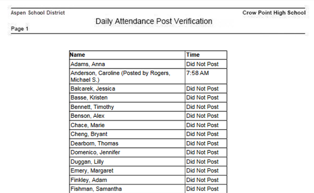 Run the Daily Attendance Post Verification report to confirm that teachers have posted their attendance from the Staff view for the date you specify. Next to each teacher’s name, the report displays the time he or she posted attendance.