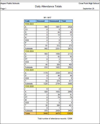 Run the Daily Attendance Totals report to view, by year of graduation, attendance totals for your school for the date range you specify. You have the option of sorting the results by attendance code or by count:
