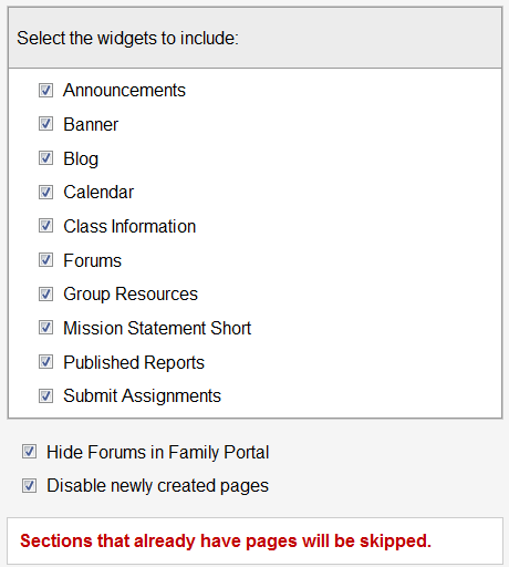 1. By default, all of the widgets are selected to be included. Deselect any that you do not want to appear on your Pages.
