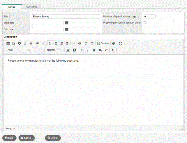 On the Questions sub-tab, click Add. Add as many questions as needed. Click herefor more information on adding questions.