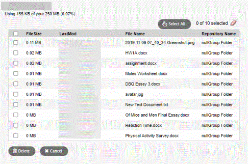 • If you are running out of space and want to delete multiple files at once, click the My Quota link on the Group Resources widget.