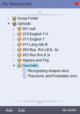 Note: Files uploaded to My Resources cannot be edited in My Resources. To edit a file stored in My Resources, download it to your computer, edit the file, and upload it again.
