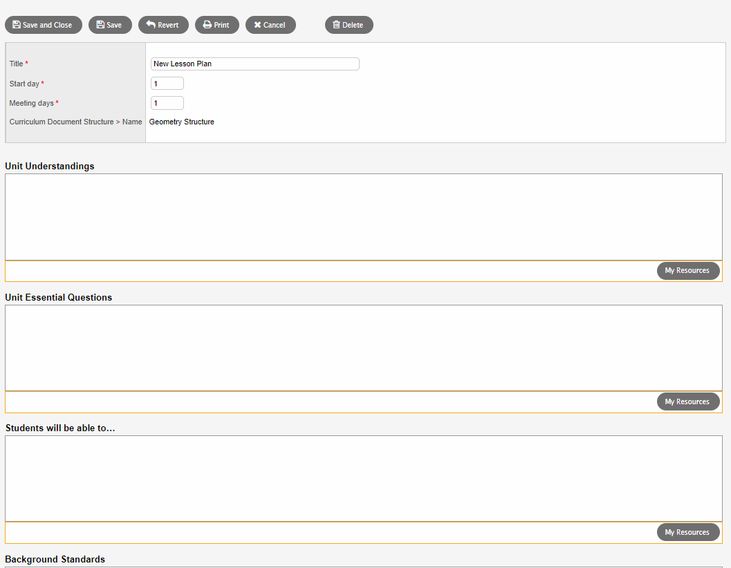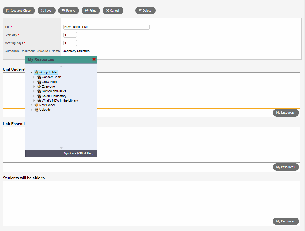 1. For each field, click My Resources to access your personal resources and any shared resources (including district resources) you want to add to the lesson plan: