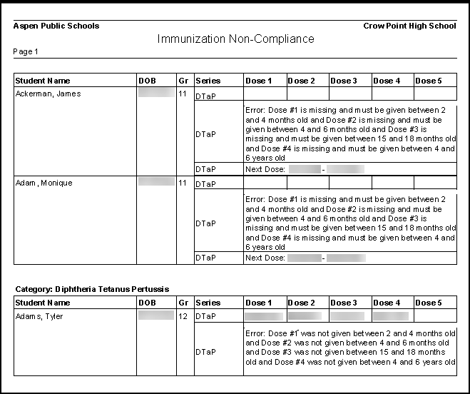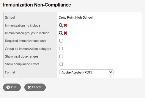 Run the Immunization Non-Compliance report to view a list of immunizations that students are not in compliance with.