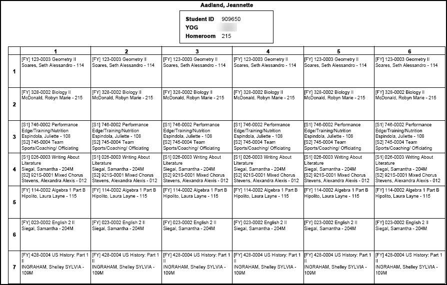 Run the Student Schedule Matrix to view the sections in which the system scheduled students each period, each day, and each term: