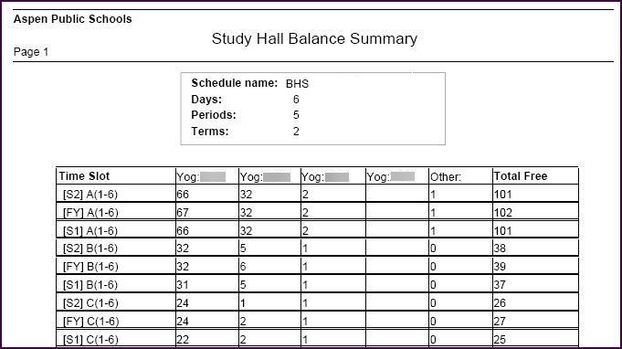 After you finish building your master schedule and loading students into it, run the Study Hall Balance Summary report to determine how many study hall sections you need to create to fill the holes across all student schedules.
