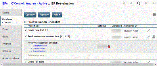 For each step in the process, your administrator creates a workflowClosed a method of coordinating multi-step processes involving one or more users, or a checklist of steps you must complete to enroll or renew a student in Special Education.