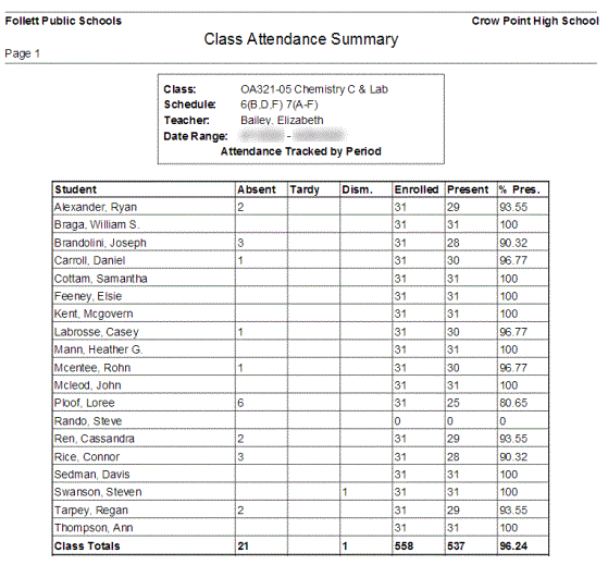 Run the Class Attendance Summary report to view class attendance counts for each student for a date range. You can also view the number of days students were enrolled in the class, and the number of days they were present.