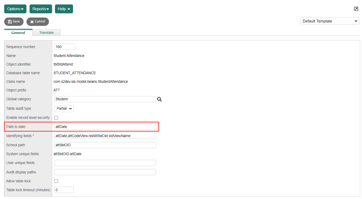 *Then they identify the field on the Student Attendance table that corresponds with the date on student records (District [Root Organization] view, Admin > Data Dictionary > Tables >select Student Attendance>Fields). In this case, the object identifier (OID) attDate corresponds with that date.