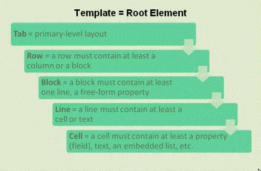 - Nest property tags inside various layout tags to create the layout of the template.