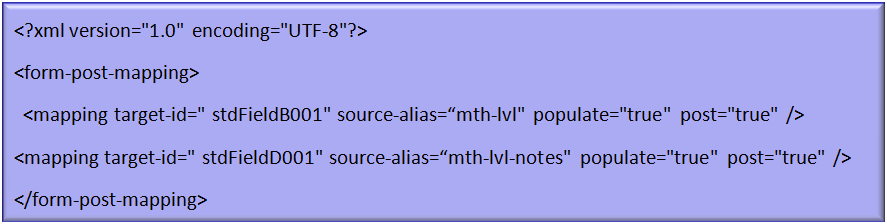 When defining the details of the form, at the Post mapping field, use XML to customize the form so that after the teacher enters the recommended level, a field is updated with this information. Type the following: